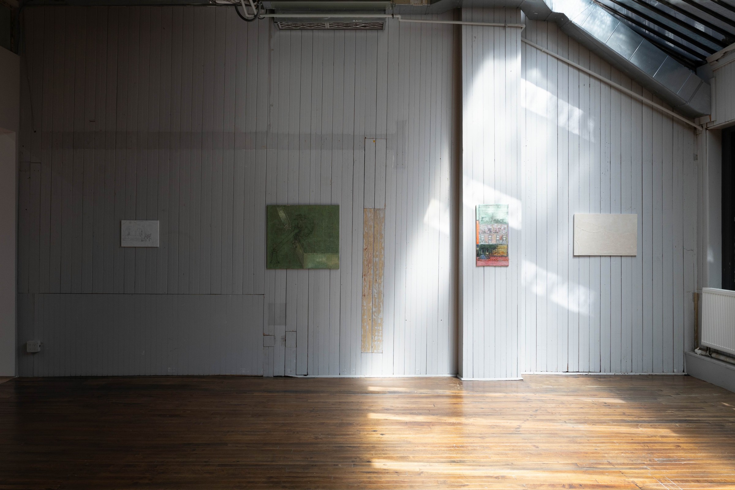 The works incorporate a range of materials, including casein, threads, pearlescent abalone shell pigment, and convict-made bricks from former Sydney prison labor sites. These bricks have been broken into rubble, ground into pigment, and reconstituted into the painting surfaces. Rand first encountered them bearing the thumb impressions of their makers—a physical connection to long-gone European convicts, deported for crimes such as stealing sugar or wrecking textile machinery. The latter recalls Machine Breakers—Rand's recent solo debut in the UK, which considered the activities of the Luddites.